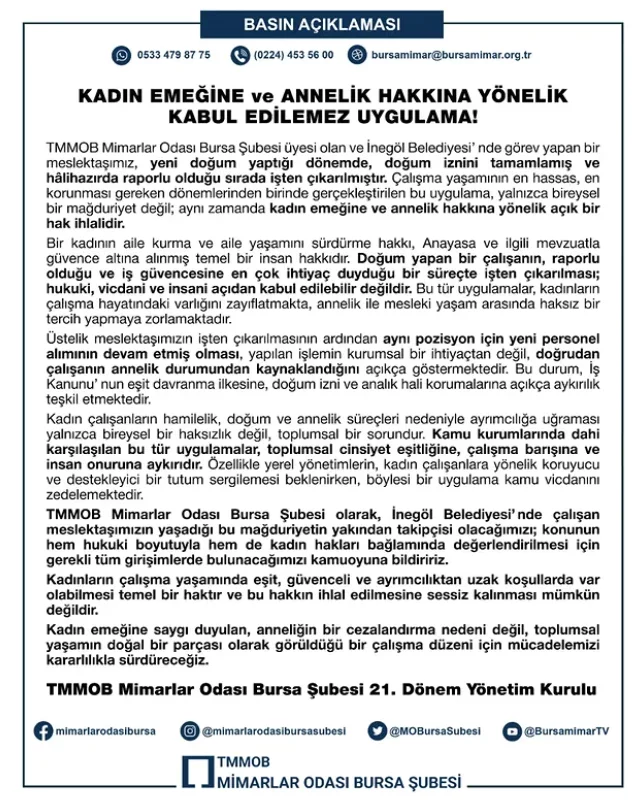 "TMMOB Mimarlar Odası Bursa Şubesi üyesi olan ve İnegöl Belediyesi'nde görev yapan meslektaşımız, yeni doğum yaptığı dönemde, doğum iznini tamamlamış ve hâlihazırda raporlu olduğu sırada işten çıkarılmıştır. Çalışma yaşamının en hassas, en korunması gereken dönemlerinden birinde gerçekleştirilen bu uygulama, yalnızca bireysel bir mağduriyet değil; aynı zamanda kadın emeğine ve annelik hakkına yönelik açık bir hak ihlalidir.