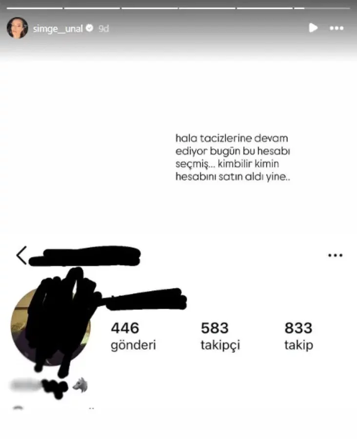 Ardından bir paylaşımda daha bulunan ve tacizlerin devam ettiğini söyleyen Simge Ünal, "Hâlâ tacizlerine devam ediyor. Bugün bu hesabı seçmiş. Kim bilir kimin hesabını satın aldı yine..." ifadelerini kullandı.