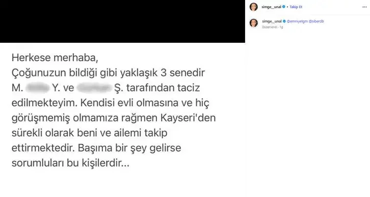 Paylaşımına Emniyet Genel Müdürlüğü'nü de etiketleyen Simge Ünal; "Çoğunuzun bildiği gibi yaklaşık 3 senedir M. A. Y. ve G. Ş. tarafından taciz edilmekteyim. Kendisi evli olmasına ve hiç görüşmemiş olmamıza rağmen Kayseri'den sürekli olarak beni ve ailemi takip ettirmektedir. Başıma bir şey gelirse sorumluları bu kişilerdir" dedi.