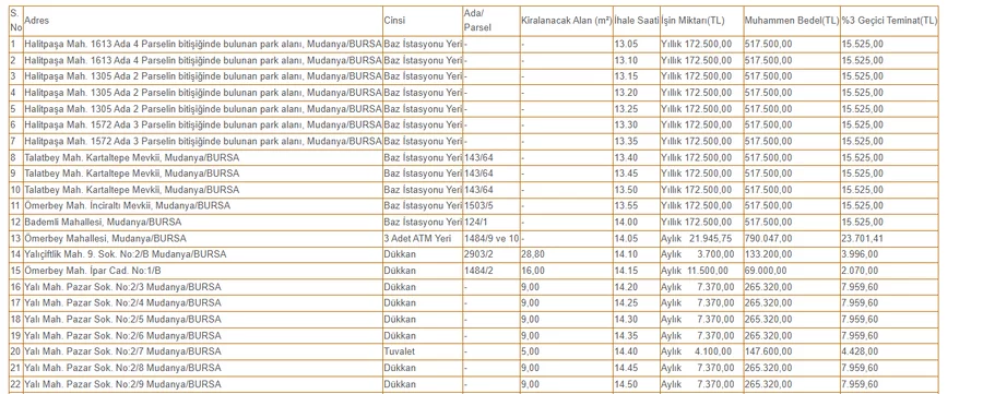 İhale kapsamında 12 baz istasyonu yeri, 3 adet ATM yeri, 22 dükkan, 1 tuvalet ile 5 tarla ve 2 çayır kiraya verilecek.