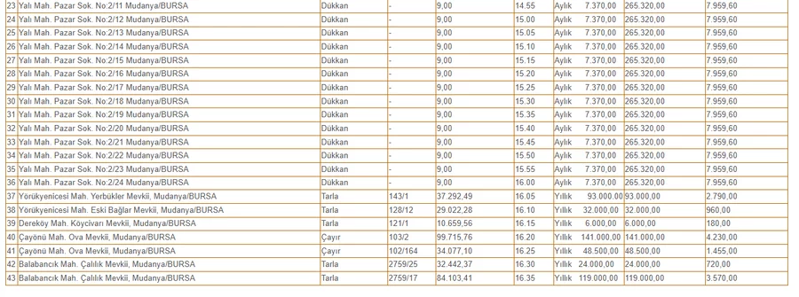 Mudanya Belediyesi, mülkiyeti ve tasarrufu belediyeye ait 43 taşınmazı kiraya vermek üzere ihaleye çıkıyor.