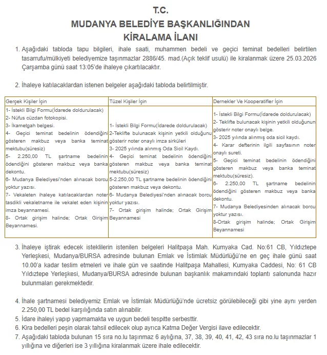BURSA, 03 Mart 2026 Salı, 12:24Mudanya Belediyesi, mülkiyeti belediyeye ait toplam 43 taşınmazı ihaleyle kiraya verecek.