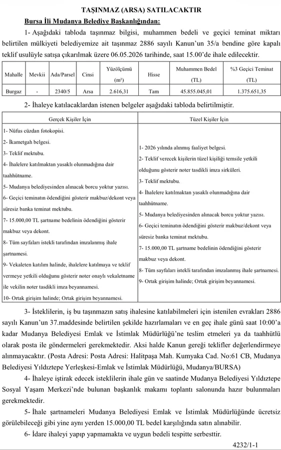 Mudanya Belediye Başkanlığı'ndan yapılan duyuruya göre, 2 bin 616 metrekare yüzölçümüne sahip arsa için muhammen bedel 45 milyon 855 bin 45 TL olarak belirlendi.