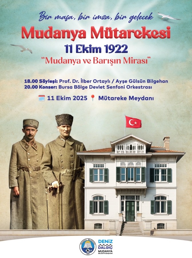 BURSA, 09 Ekim 2025 Perşembe, 11:36Türkiye'nin bağımsızlık yolundaki en önemli dönüm noktalarından biri olan Mudanya Mütarekesi'nin imzalanışının 103. yılı, Mudanya Belediyesi tarafından düzenlenecek etkinliklerle kutlanacak.