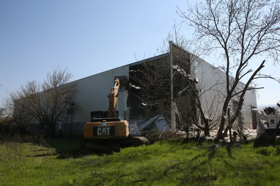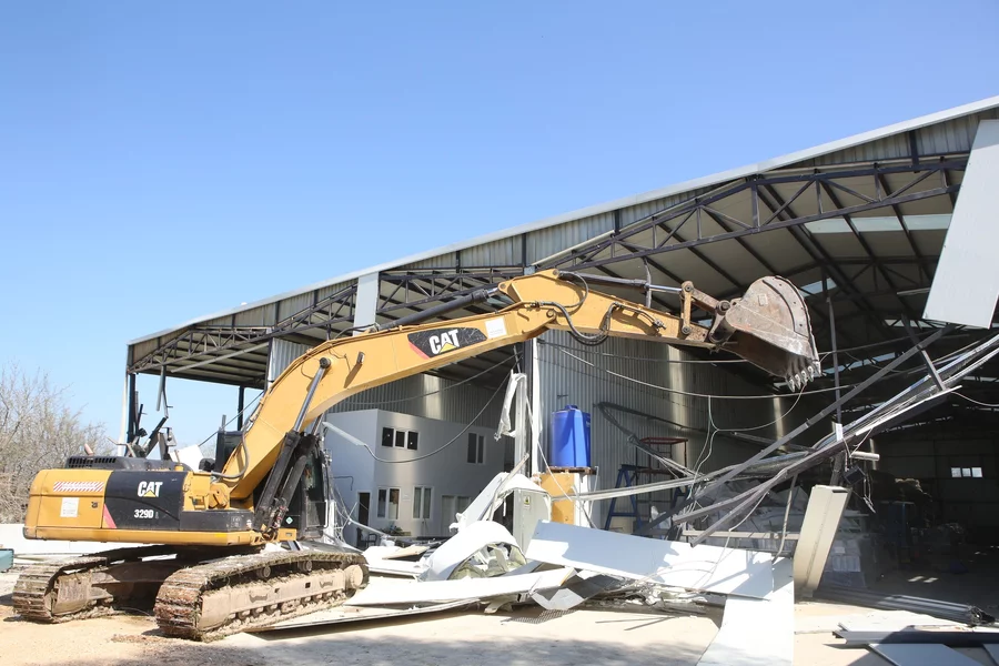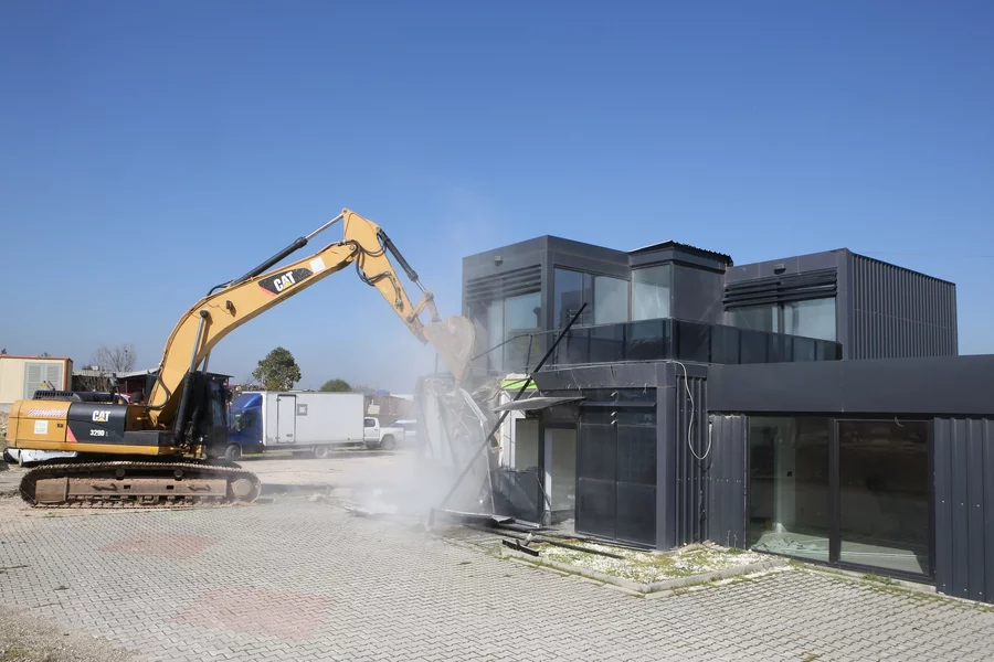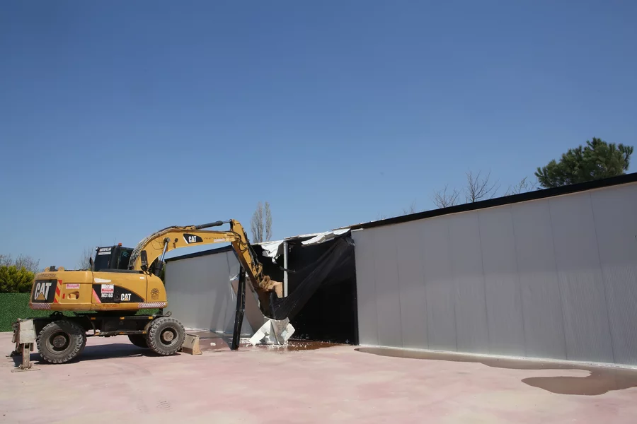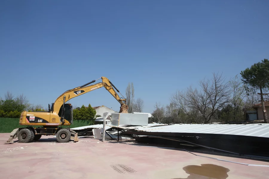Yıkım çalışması kapsamında ilk olarak, Demirci Mahallesi'nde tespit edilen 192 metrekarelik iki katlı ofis binasına müdahale edildi.