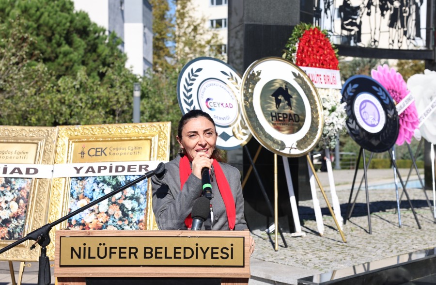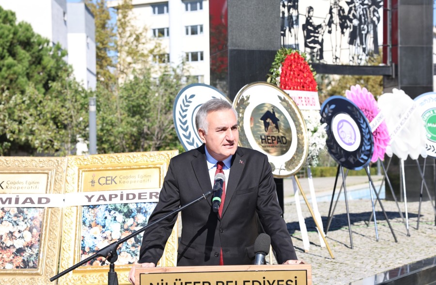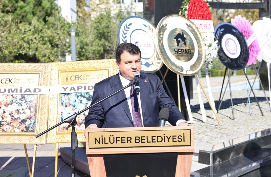 Saygı duruşu ve İstiklal Marşı'nın okunmasının ardından konuşan Nilüfer Belediye Başkanı Şadi Özdemir, "Bugün, bir milletin küllerinden yeniden doğduğu, özgürlüğü, eşitliği ve adaleti temel alan yeni bir yaşamı kurduğu büyük günün yıl dönümündeyiz" dedi.