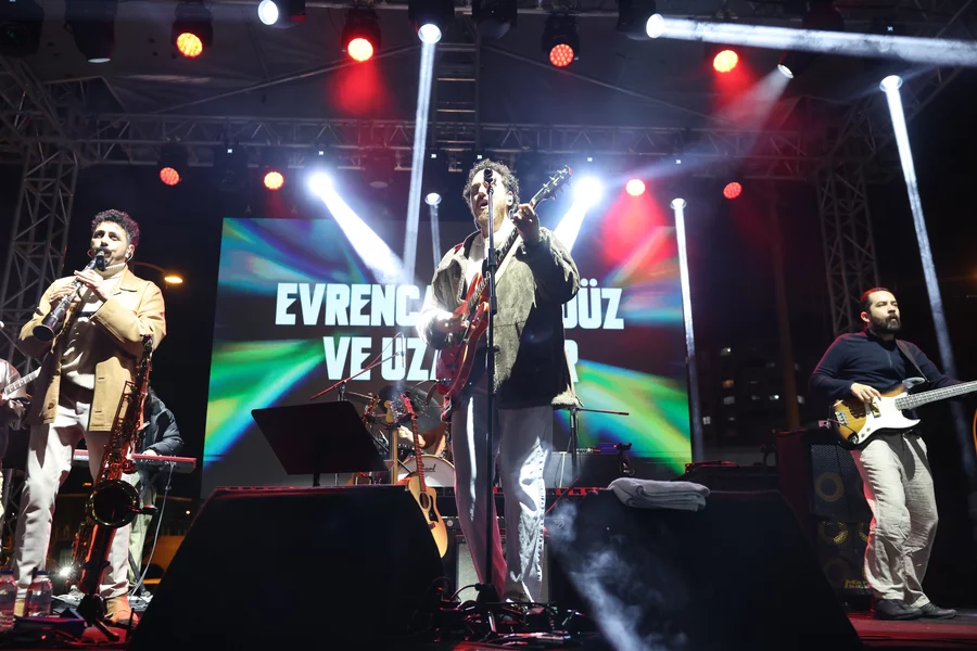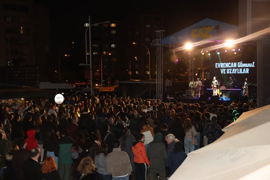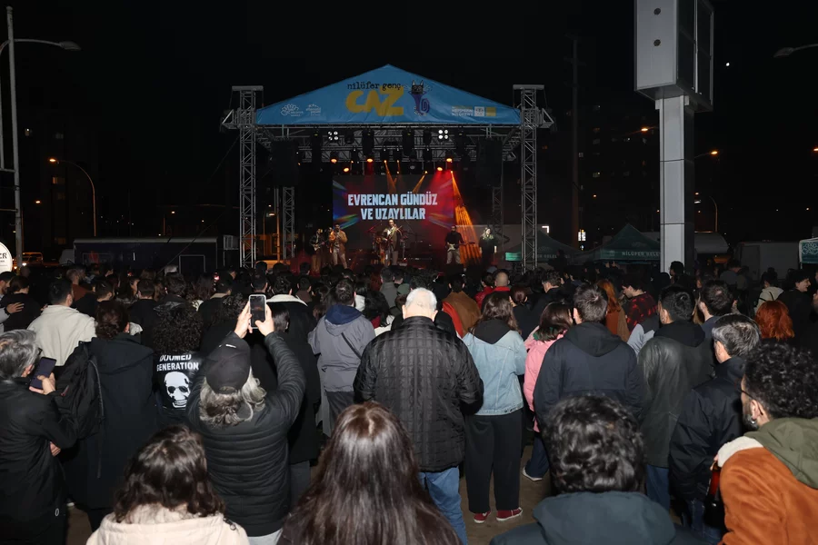 BURSA, 17 Şubat 2026 Salı, 09:53Nilüfer'de dört gündür devam eden ve 15'ten fazla sanatçının sahne aldığı Nilüfer Genç Caz konserleri, yoğun katılımlı bir finalle tamamlandı. Etkinliğin son gününde sahneye çıkan sevilen sanatçı Evrencan Gündüz ve grubu Uzaylılar, performanslarıyla izleyicilerden tam not aldı. Nazım Hikmet Kültürevi önünde düzenlenen konseri, Nilüfer Belediye Başkanı Şadi Özdemir ve eşi Nuray Özdemir de vatandaşlarla birlikte izledi.