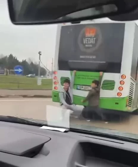 BURSA, 16 Ocak 2026 Cuma, 10:24Bursa'da otobüsün arkasına tutunarak ayaklarını yere sürüyen 10-15 yaşlarındaki 2 çocuk, trafikte tehlike saçtı. O anlar cep telefonu kamerasına yansıdı.
