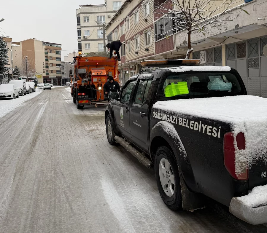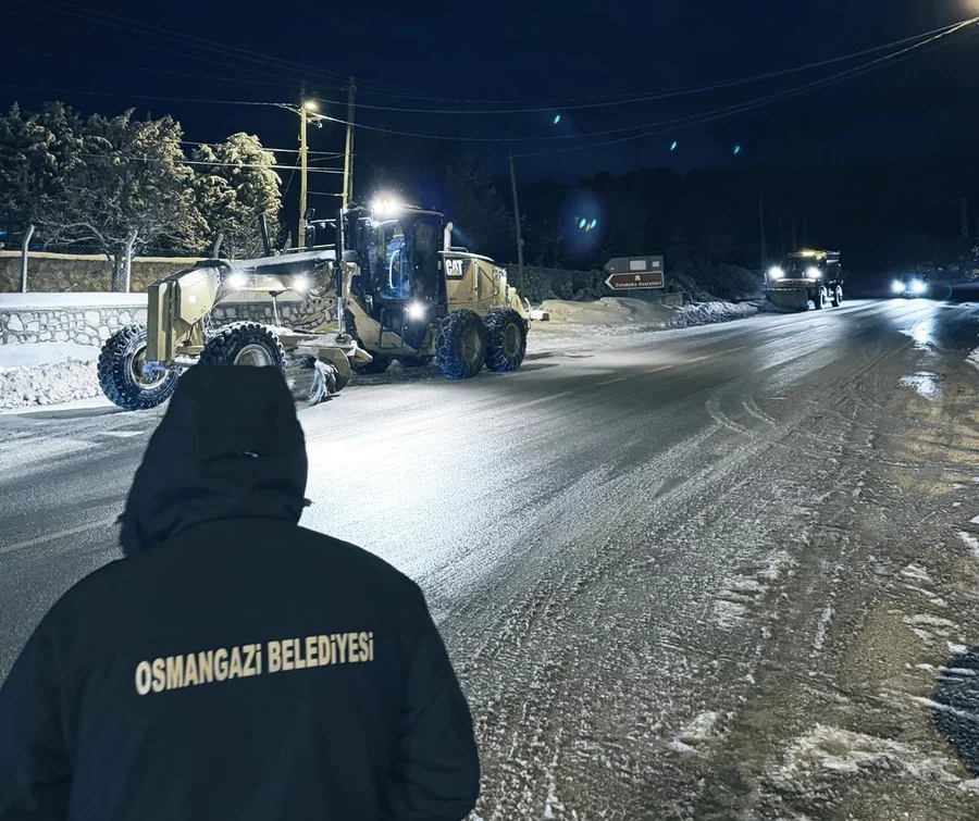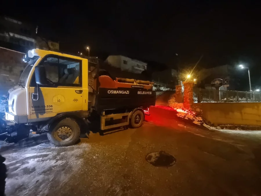 Osmangazi Belediyesi Fen İşleri Müdürlüğü'ne bağlı ekipler, 2026'nın ilk saatleri itibarıyla başlayan kar yağışının etkisiyle anında harekete geçti.