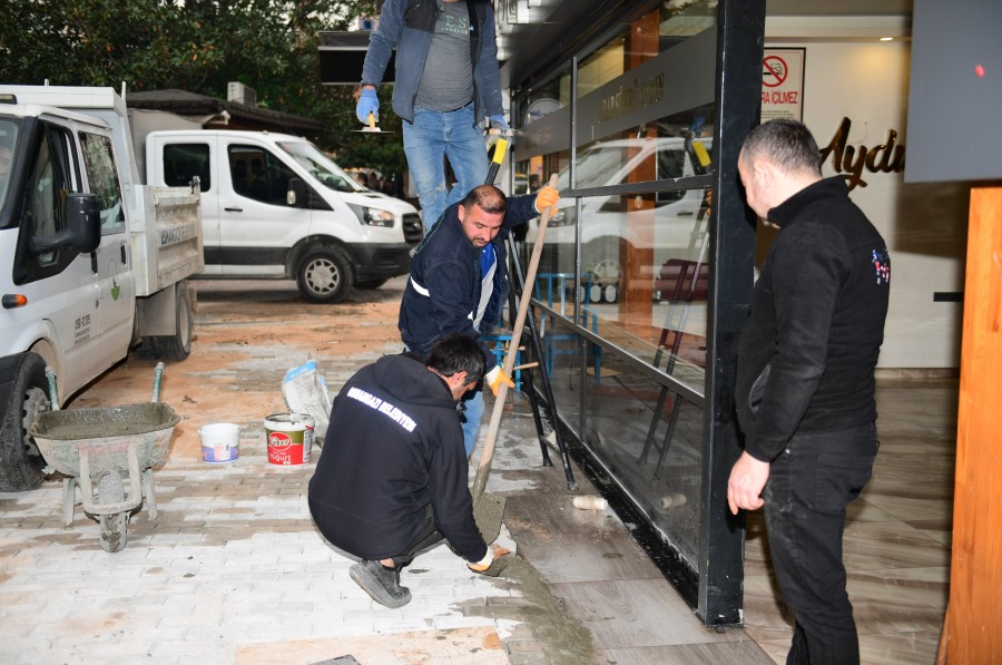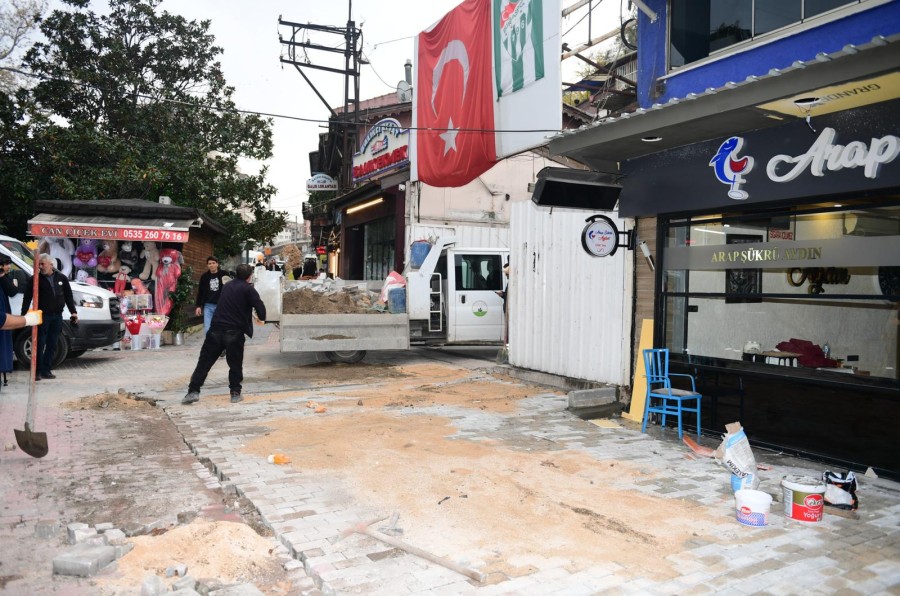 Ekipler, Türk bayraklarını ve Atatürk posterlerini özenle yerlerinden alıp işletmelere teslim ettikten sonra çalışmalara başlarken; zemindeki kaplamaları da dikkatli bir şekilde sökerek sokağın doğal dokusunu korudu.