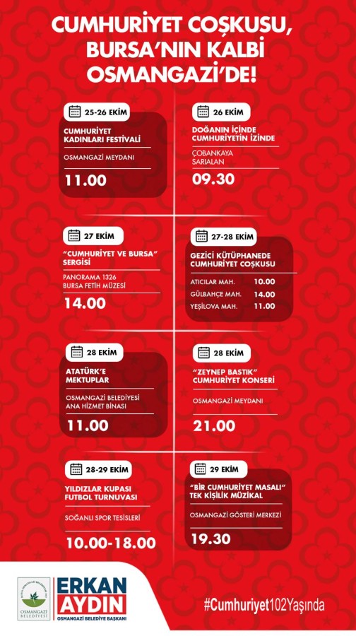 BURSA, 24 Ekim 2025 Cuma, 15:53Osmangazi Belediyesi, 25-29 Ekim tarihleri arasında düzenleyeceği dolu dolu programlarla Cumhuriyet Bayramı coşkusunu tüm ilçeye yayacak. Osmangazi Belediye Başkanı Erkan Aydın, tüm Bursalıları Cumhuriyetin 102. yıl dönümünü birlikte kutlamaya davet etti.