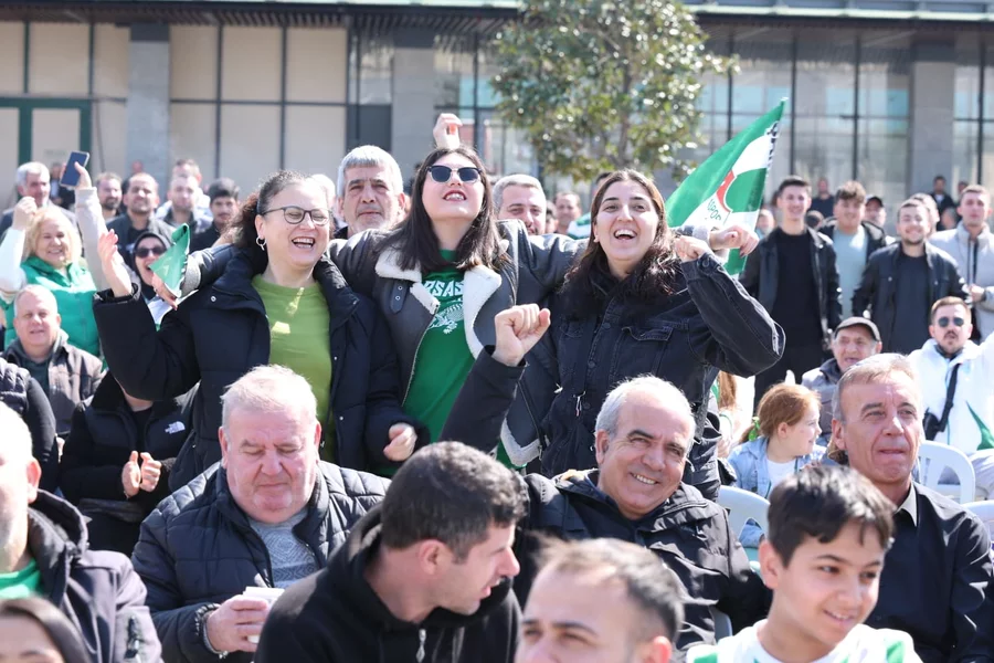 BURSA, 12 Nisan 2026 Pazar, 18:18Osmangazi Belediyesi tarafından kurulan dev ekranda Bursaspor maçını izlemek isteyen taraftarlar, Osmangazi Meydanı'na akın etti. Yeşil-beyaz renklere gönül verenlerin yoğun ilgi gösterdiği organizasyonda meydan, karşılaşmanın başlama düdüğüyle birlikte büyük bir coşkuya sahne oldu. Osmangazili vatandaşlar, mücadeleyi ellerinde bayrak ve atkılarla büyük bir heyecanla takip etti.