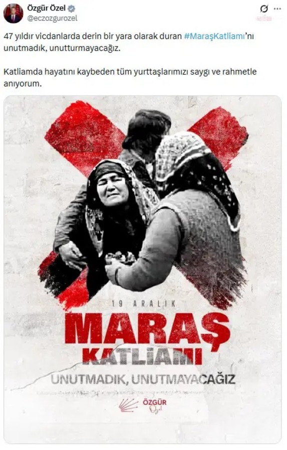 Cumhuriyet Halk Partisi (CHP) Genel Başkanı Özgür Özel, "47 yıldır vicdanlarda derin bir yara olarak duran Maraş Katliamı'nı unutmadık, unutturmayacağız. Katliamda hayatını kaybeden tüm yurttaşlarımızı saygı ve rahmetle anıyorum" dedi.