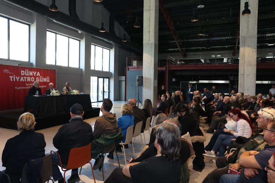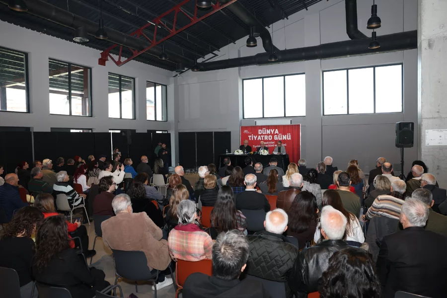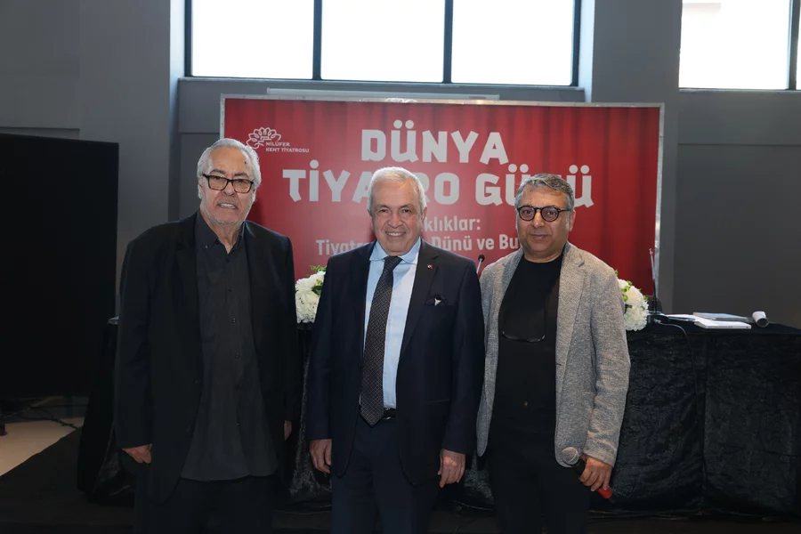 BURSA, 26 Mart 2026 Perşembe, 17:56Nilüfer Belediyesi'nin Dünya Tiyatro Günü kapsamında düzenlediği "Tanıklıklar: Tiyatromuzun Dünü ve Bugünü" söyleşisi, Pancar Deposu'nda gerçekleştirildi. Nilüfer Kent Tiyatrosu yöneticisi Kazım Güçlü'nün moderatörlüğünü yaptığı söyleşide usta tiyatro sanatçısı ve yönetmen Rutkay Aziz ile Nilüfer Belediye Başkanı Şadi Özdemir yer aldı. Söyleşinin başında Kazım Güçlü, Süreyya Karacabey'in alternatif Dünya Tiyatro Günü Bildirisi'ni okudu.