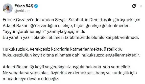 Kararı sosyal medya hesabından açıklayan Baş, "Edirne Cezaevi'nde tutulan Sevgili Selahattin Demirtaş ile görüşmek için Adalet Bakanlığı'na verdiğim dilekçe, hiçbir gerekçe gösterilmeden "uygun görülmemiştir" yanıtıyla geçiştirildi. Bu yanıtın yazılı olarak iletilmesi talebimize de olumlu karşılık verilmedi" dedi.