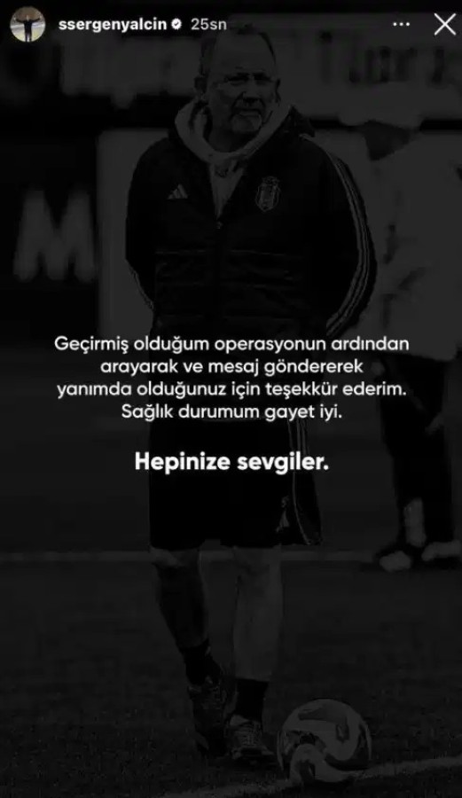 SPOR, 18 Kasım 2025 Salı, 22:29Beşiktaş Teknik Direktörü Sergen Yalçın, operasyon geçirmesinin ardından sağlık durumu hakkında sosyal medya hesabından açıklama yaptı.