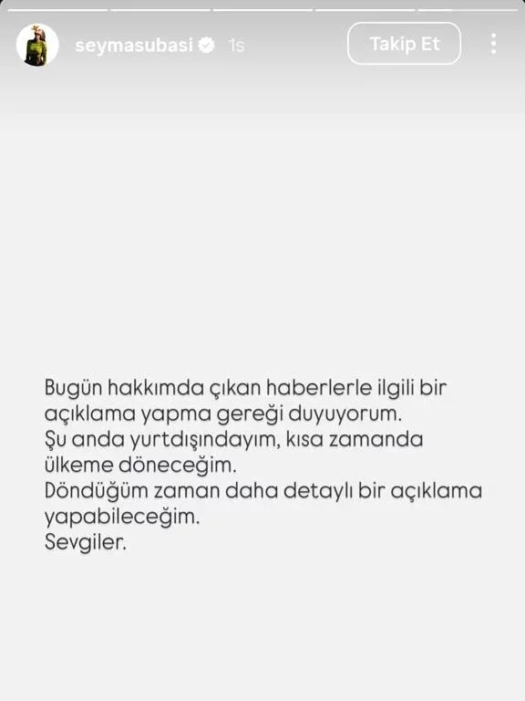 "Hakkımda çıkan haberlerle ilgili bir açıklama yapma gereği duyuyorum. Şu anda yurt dışındayım, kısa zamanda ülkeme döneceğim. Döndüğüm zaman daha detaylı bir açıklama yapabileceğim. Sevgiler..."