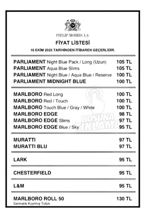 Marlboro markasında "Red Long", "Red", "Touch", "Touch Blue", "Gray" ve "White" çeşitleri 100 TL olacak. "Edge" serisinde ise fiyatlar 98 TL, 97 TL ve 95 TL bandında değişiklik gösteriyor.