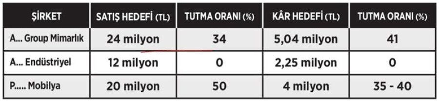 Üç şirketin toplam hedefi yaklaşık 56 milyon TL satış ve 11,3 milyon TL net kâr iken gerçekleşen tutarlar yalnızca 18-19 milyon TL satış ve 3,5-3,7 milyon TL kâr düzeyinde kaldı. Bu da toplam hedeflerin yaklaşık yüzde 30'una ulaşılabildiğini gösterdi.
