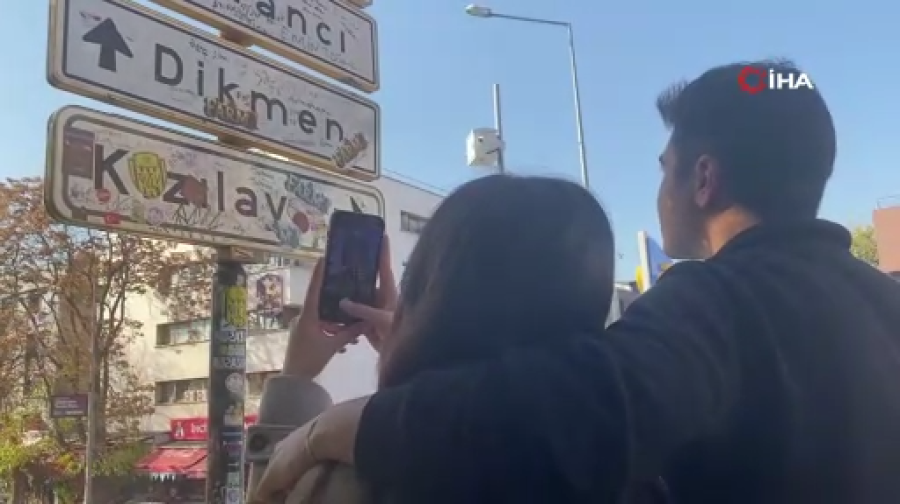 Öte yandan ailesiyle birlikte Denizli'den Ankara'ya gelen bir genç de sosyal medya akımına katılıp, Kızılay tabelasına asılarak fotoğraf çektirdi. Ailesi ile Ankara'ya gezmeye gelen Nilo Mehra isimli genç, "Hazır buraya gelmişken tabelayı da görmek istedim. Çünkü şu sıralar sosyal medyada bayağı bir popüler oldu. Amacım video çekmekti ama pek yetişemedim, ben de tabela ile fotoğraf çektirdim. Gördüğüm kadarıyla yeni tabela değil, tekrardan yerine monte etmişler "dedi.