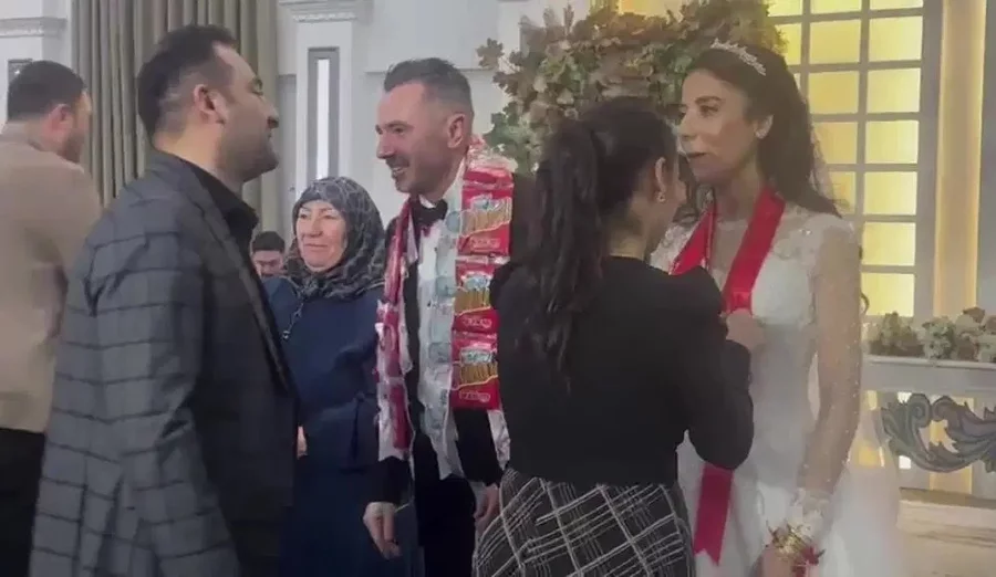 Damat boynuna asılan hediyeleri şaşkınlıkla karşılaşırken, konuklar kahkahalara boğuldu.