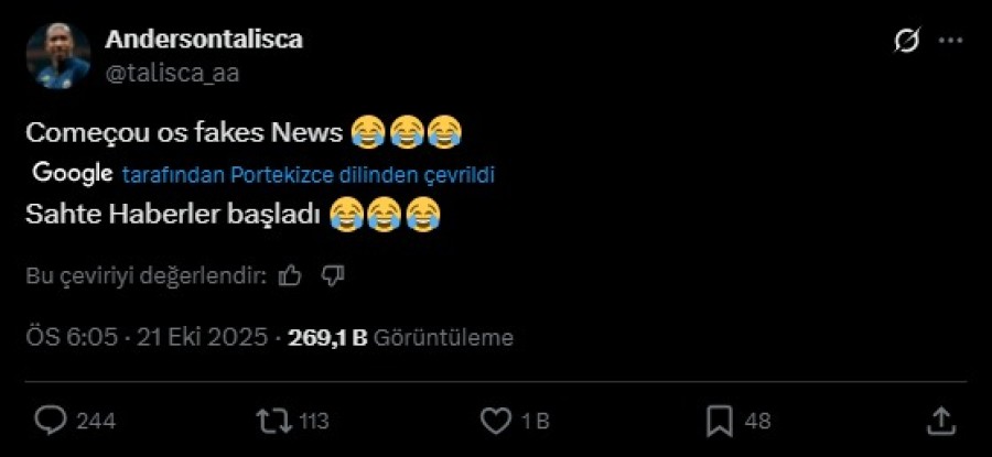 SPOR, 21 Ekim 2025 Salı, 19:45Fenerbahçe forması giyen Anderson Talisca, hakkında çıkan ayrılık iddialarına yanıt verdi. Talisca, "Sahte haberler başladı" dedi.