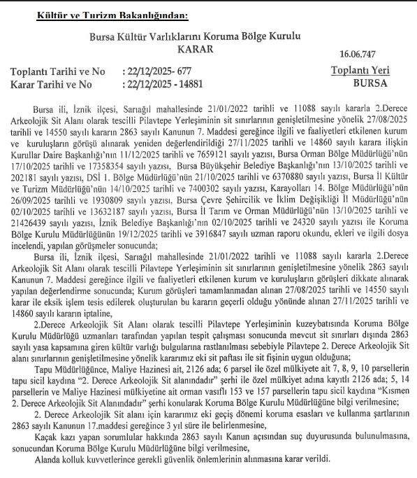İznik'in Sarıağıl Mahallesi'nde bulunan ve 2022 yılında 2. Derece Arkeolojik Sit Alanı ilan edilen Pilavtepe Yerleşimiyle ilgili daha önce alınan bir karar yeniden değerlendirildi.