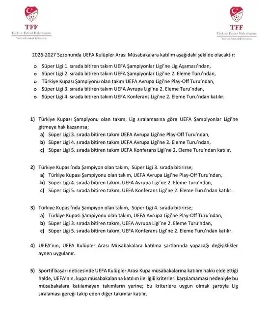 TFF tarafından yapılan resmi açıklamada, "UEFA'nın katılım listesine ilişkin sirküleri uyarınca, 2026-2027 sezonunda ülkemiz, UEFA Şampiyonlar Ligi'nde 2 takım, UEFA Avrupa Ligi'nde 2 takım ve UEFA Konferans Ligi'nde 1 takım olmak üzere toplam 5 takım ile temsil edilecektir" ifadeleri yer aldı.