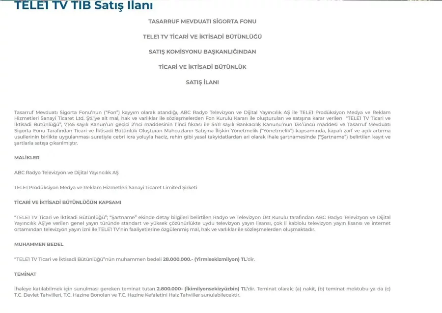 Satış kapsamında, "TELE1 TV Ticari ve İktisadi Bütünlüğü" yer alıyor. Belirlenen muhammen bedel ise 28.000.000 TL olarak duyuruldu.