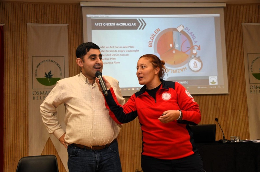 Konuşmaların ardından Başkan Erkan Aydın, Osmangazi Kent Konseyi Engelliler Meclisi ve OBAM üyeleriyle yakından ilgilenerek hatıra fotoğrafı çektirdi. Bunun yanı sıra program sonunda Osmangazi Belediyesi Afet İşleri Müdürlüğü ekipleri tarafından katılımcılara afet farkındalık eğitimi verildi. Eğitimi özveriyle takip eden engelli bireyler, afetlerin oluşum nedenleri, risklerin nasıl azaltılabileceği, afetlerde önem taşıyan davranış biçimleri konularında bilgilendirildi.