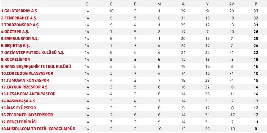 Sarı-kırmızılı takım 33 puanla liderliğini sürdürürken, Fenerbahçe 32 puanla rakibini takip etmeye devam etti. Trabzonspor ise 31 puanla iki ekibin ardında üçüncü sırada kendine yer buldu.