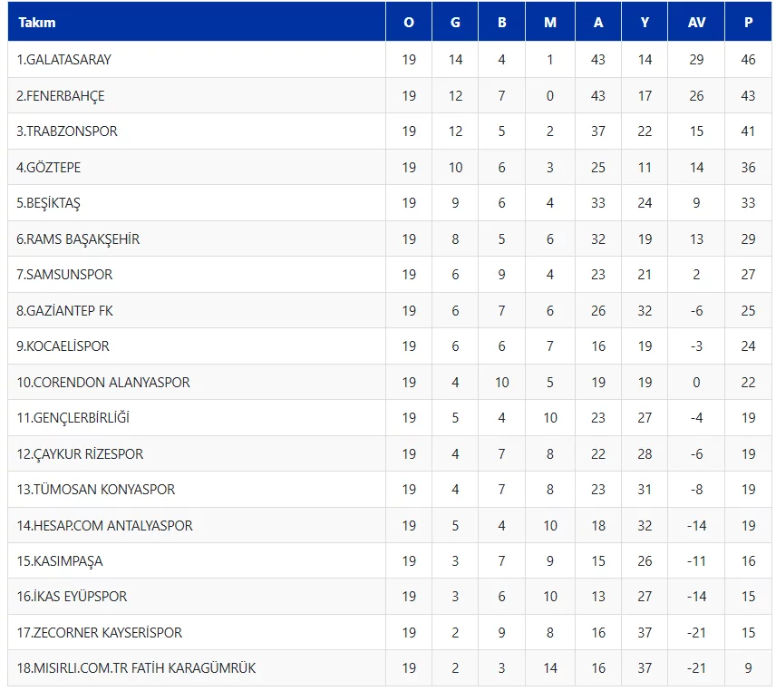 Süper Lig'de 19. haftanın ardından oluşan puan durumu şöyle: