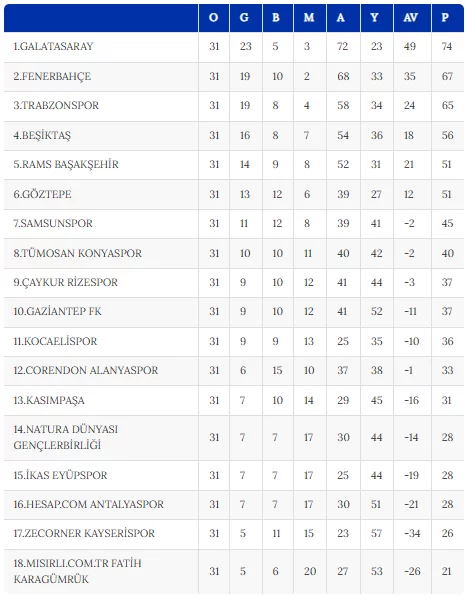 Ligde 31. hafta müsabakalarının ardından oluşan puan durumu şöyle: