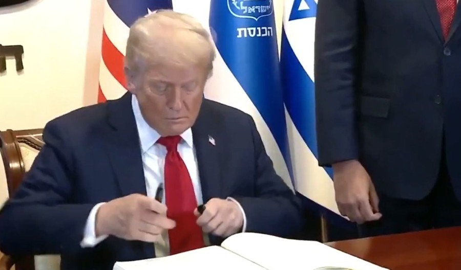 Donald Trump, İsrail Meclisi (Knesset) binasına ulaştı. Meclis'te İsrail Başbakanı Binyamin Netanyahu ve Meclis Başkanı Amir Ohana tarafından karşılanan Trump, İsrail Meclis binasında bulunan hatıra defterini imzaladı. ABD Başkanı, hatıra defterine "Bu benim için büyük bir onur - harika ve güzel bir gün. Yeni bir başlangıç." ifadelerini yazdı.