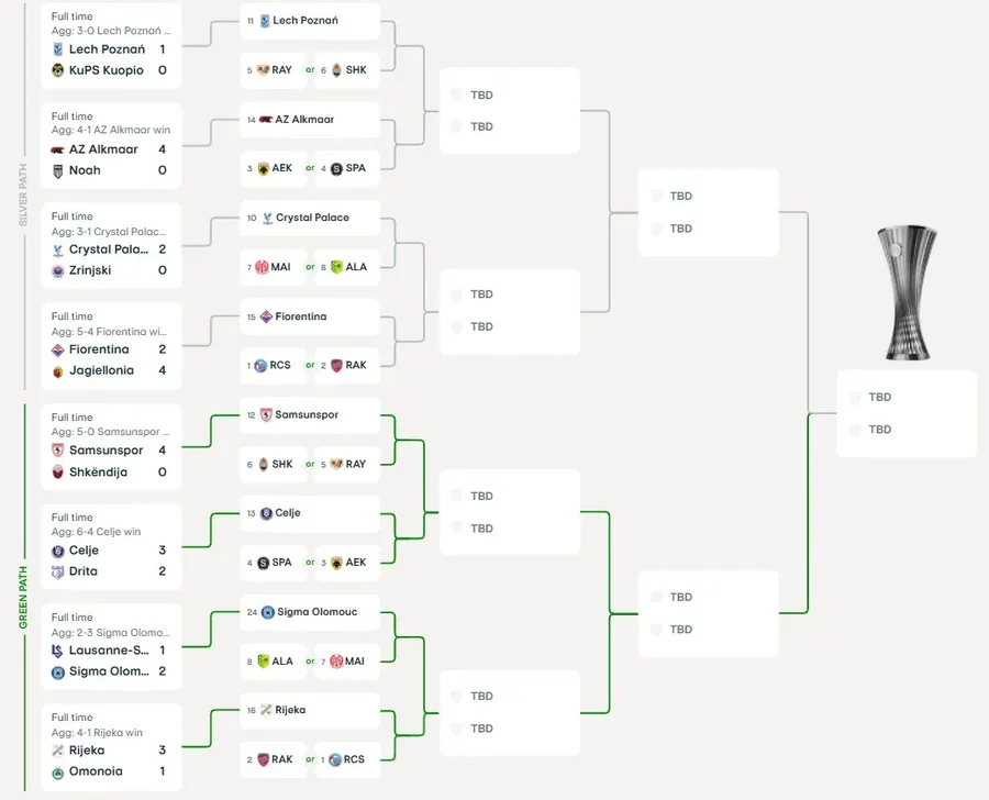 UEFA Konferans Ligi'nin lig etabında ilk 8'e giren Strasbourg, Rakow, AEK, Sparta Prag, Rayo Vallecano, Shakhtar Donetsk, Mainz ve AEK Larnaca doğrudan son 16 turuna kalmıştı.