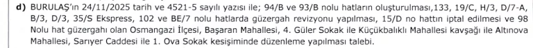 BURULAŞ'ın ikinci başvurusu kapsamında 611/C hattının oluşturulması ve çok sayıda hatta yapılması talep edilen güzergâh revizyonları için ilgili kurum temsilcilerinden oluşan yeni bir Alt Komisyon kurulacak. Hazırlanacak rapor, bir sonraki UKOME toplantısında görüşülecek.