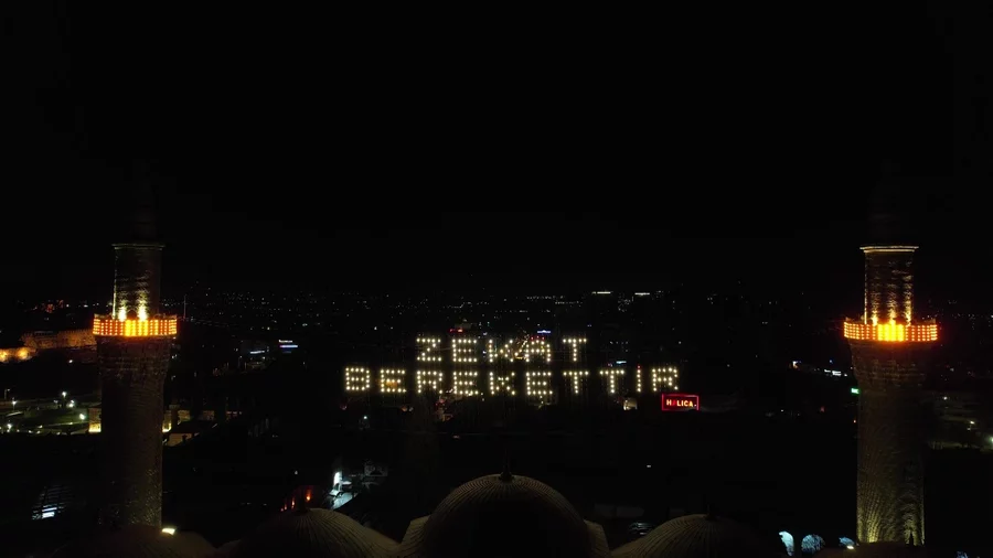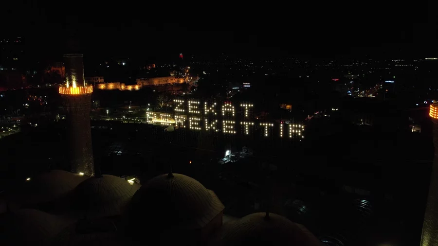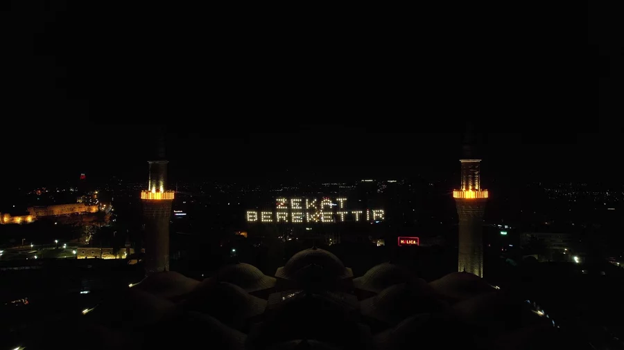 Ulucami'nin yeni mahyası "Zekat Berekettir" yazısı ile şehri aydınlattı