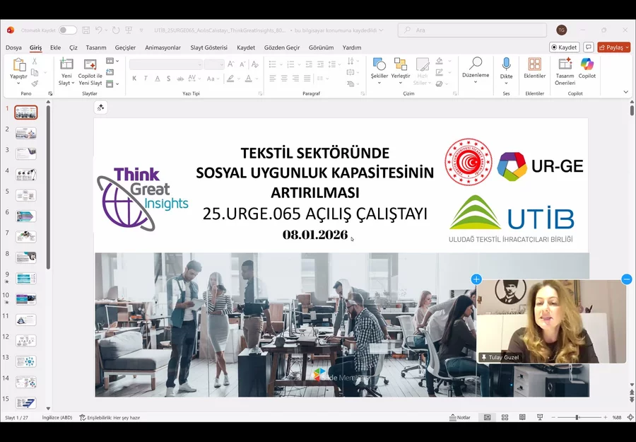 Dr. Güzel sunumunda, "UR-GE projelerinde oluşturulan ihtiyaç analizi raporu, firmaların sosyal uygunluk ve çevresel kapasite başta olmak üzere mevcut yapılarını doğru analiz etmelerine ve ihtiyaçlarına uygun bir gelişim yol haritası oluşturmalarına imkân tanıyor. Yapılan ihtiyaç analizi sayesinde firmalar; hangi alanlarda güçlenmeleri gerektiğini net bir şekilde görebiliyor, eğitim ve danışmanlık süreçlerini kendi önceliklerine göre şekillendirebiliyor. Sosyal uygunluk, sürdürülebilirlik, üretim süreçlerinin geliştirilmesi, tasarım ve trend odaklı yaklaşımlar ile dijital dönüşüm gibi birçok başlıkta planlanan danışmanlık ve eğitim faaliyetleri, firmaların kurumsal altyapılarını güçlendirirken ihracat pazarlarına daha hazırlıklı ve rekabetçi şekilde açılmalarını sağlıyor. Bu kapsamlı ve değerli sürecin hayata geçirilmesinde başta Ticaret Bakanlığımız olmak üzere, UTİB'e ve katkı sunan tüm paydaşlara teşekkür ediyor, süreci verimli ve uyum içinde gerçekleştireceğimize inanıyorum." ifadelerini kullandı.