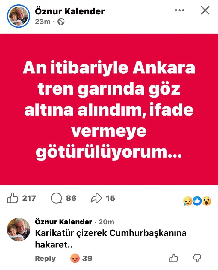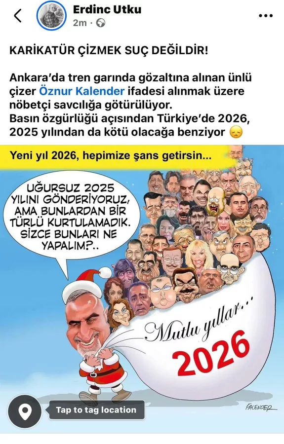 GÜNDEM, 17 Şubat 2026 Salı, 17:02Çizer Öznur Kalender, 2026 yılına girerken, yılbaşı temasıyla çizdiği bir karikatürü sebebiyle Ankara Tren Garı'nda gözaltına alındı.