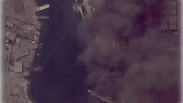 Pazartesi öğleden sonra kaydedilen görüntülerde, limandaki çeşitli askeri unsurların alev aldığı görülüyor.