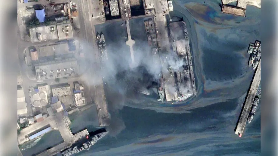 Pazar sabahına ait bir başka görüntüde ise biri kuru havuzda bulunan iki fırkateynin yanmakta olduğu, limanın farklı noktalarından da yoğun dumanların yükseldiği kaydedildi.