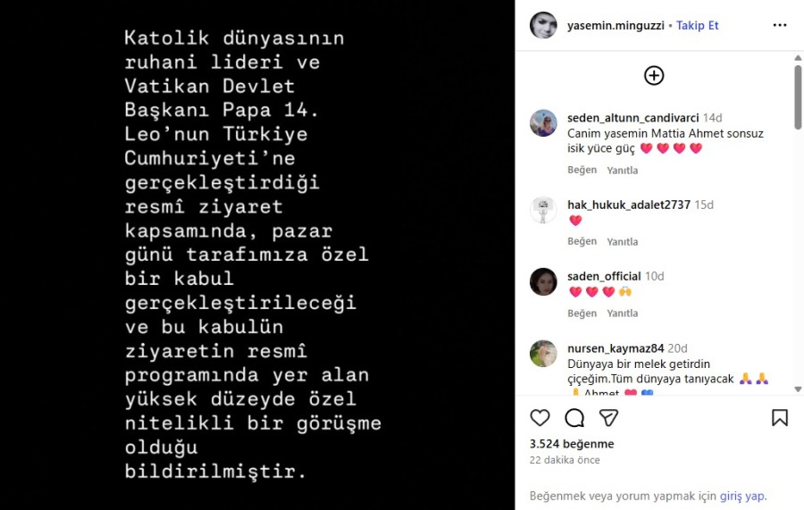GÜNDEM, 28 Kasım 2025 Cuma, 20:30İstanbul Kadıköy'de 24 Ocak'ta alışveriş yapmak için gittiği bitpazarında uğradığı bıçaklı saldırı sonucu yaşamını yitiren Mattia Ahmet Minguzzi'nin annesi Yasemin Minguzzi, sosyal medya hesabından yaptığı açıklamada Vatikan Devlet Başkanı Papa 14. Leo ile görüşeceklerini duyurdu.