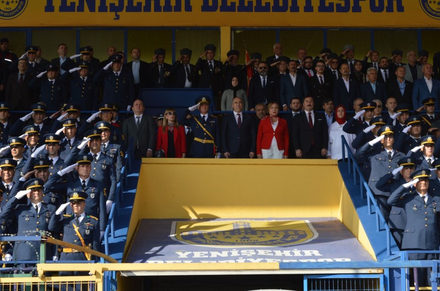 BURSA, 29 Ekim 2025 Çarşamba, 15:5729 Ekim Cumhuriyet Bayramı kutlamaları Yenişehir'de çok uzun yıllar sonra ilk defa ilçe stadyumunda büyük bir coşkuyla kutlandı. Yenişehir Kaymakamı Ümit Altay, Garnizon Komutanı İbrahim Feyzi Büğdüz, Belediye Başkanı Ercan Özel'in yanı sıra, kamu kurum ve kuruluşların temsilcileri, Türk Silahlı Kuvvetleri personeli, gaziler, öğrenciler ve çok sayıda vatandaşın katıldığı tören, sabah saatlerinde renkli görüntülere sahne oldu.