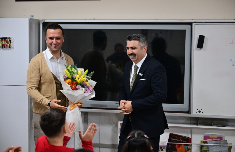 BURSA, 24 Kasım 2025 Pazartesi, 14:39Yıldırım Belediye Başkanı Oktay Yılmaz, 24 Kasım Öğretmenler Günü'nde Yıldırım'da görev yapan öğretmenleri unutmadı. Güne, Yunus Emre İlkokulu'nda başlayan Başkan Oktay Yılmaz, 4-L sınıfını ziyaret etti. Ders başladıktan sonra, kapıyı vurarak elindeki çiçekle sınıfa giren Başkan Yılmaz, öğretmen Gürkan Gökbudak ve öğrencilerine sürpriz yaptı. Çiçek verdiği Gürkan Gökbudak'ın öğretmenler gününü kutlayan Başkan Yılmaz, öğrencilerle de keyifli bir sohbet gerçekleştirdi. Ardından öğretmenler odasını ziyaret eden Başkan Oktay Yılmaz, bir araya geldiği öğretmenlere çiçek ve hediye vererek, öğretmenler gününü kutladı.