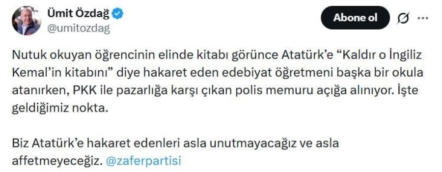 "Nutuk okuyan öğrencinin elinde kitabı görünce Atatürk'e "Kaldır o İngiliz Kemal'in kitabını" diye hakaret eden edebiyat öğretmeni başka bir okula atanırken, PKK ile pazarlığa karşı çıkan polis memuru açığa alınıyor. İşte geldiğimiz nokta. Biz Atatürk'e hakaret edenleri asla unutmayacağız ve asla affetmeyeceğiz."