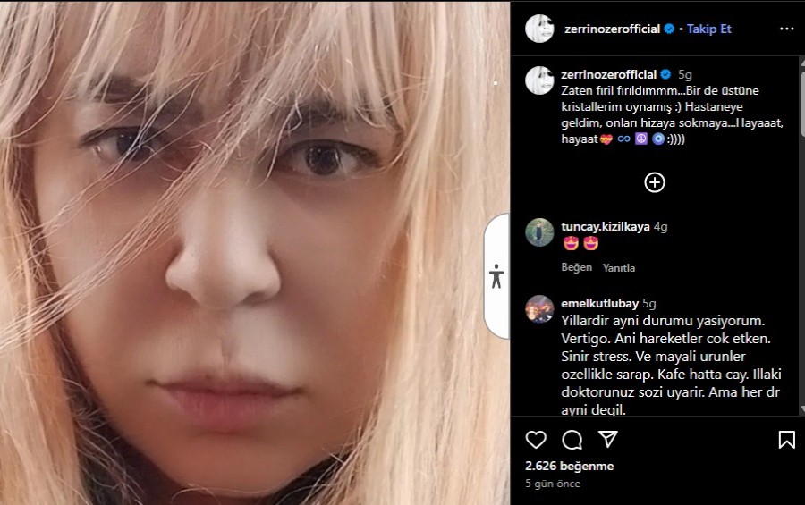 Özer, "Zaten fırıl fırıldımmm... Bir de üstüne kristallerim oynamış. Hastaneye geldim, onları hizaya sokmaya... Hayaaat, hayaat" sözleriyle hem esprili bir paylaşım yaptı.