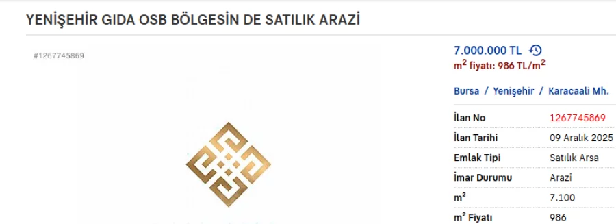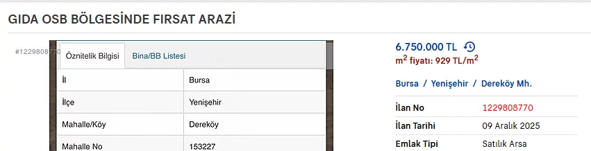 Sarı sitede metrekaresi 1000 liraya dayanan milyonlarca liralık ilanların, Yenişehir'de Gıda OSB bölgesinde satılık arazi başlığı ile pazarlanması sürecin Bursa'daki akademik odalardan, kent paydaşlarından ve kamuoyundan gizli biçimde neden yürütüldüğünün bir anlamda yanıtı!