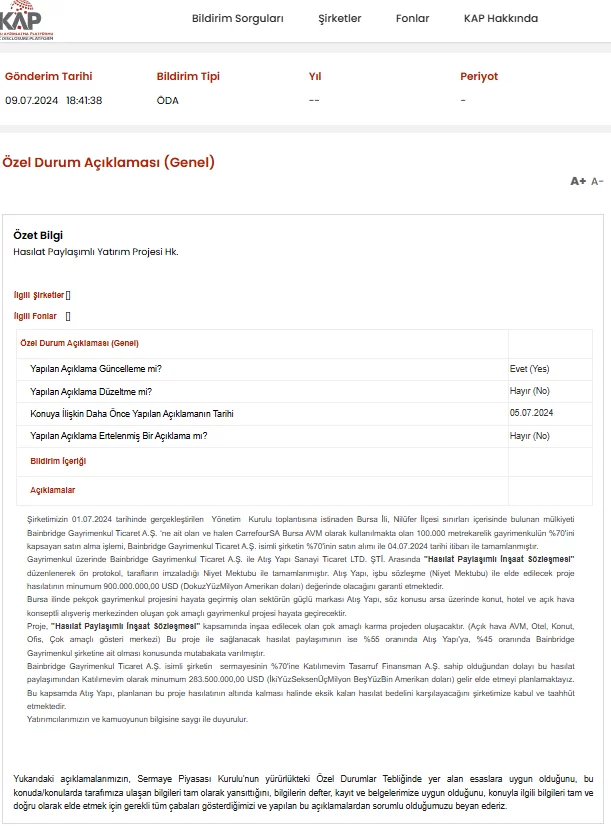 "Şirketimizin 01.07.2024 tarihinde gerçekleştirilen Yönetim Kurulu toplantısına istinaden Bursa İli, Nilüfer İlçesi sınırları içerisinde bulunan mülkiyeti Bainbridge Gayrimenkul Ticaret A.Ş.'ne ait olan ve halen CarrefourSA Bursa AVM olarak kullanılmakta olan 100.000 metrekarelik gayrimenkulün %70'ini kapsayan satın alma işlemi, Bainbridge Gayrimenkul Ticaret A.Ş. isimli şirketin %70'inin satın alımı ile 04.07.2024 tarihi itibarı ile tamamlanmıştır.
